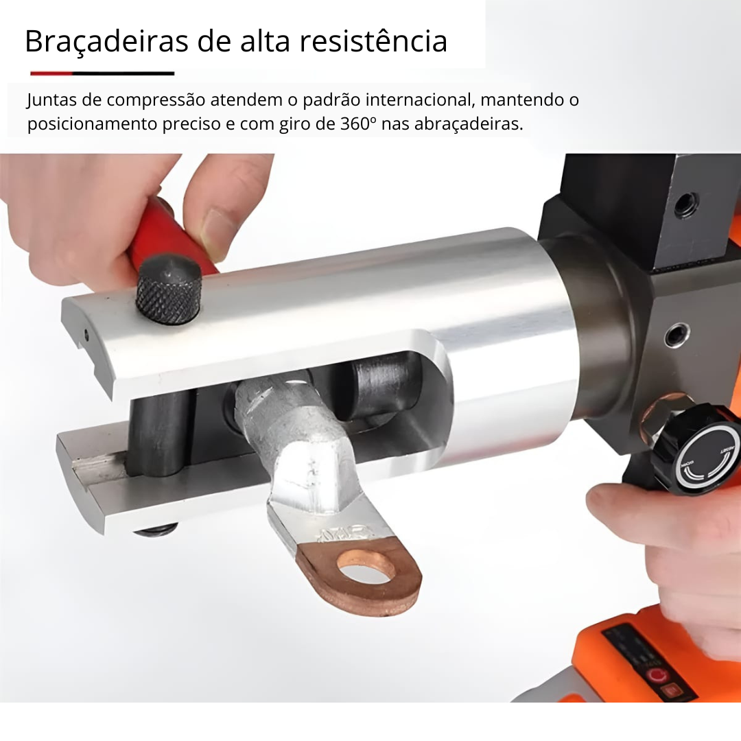 Ela vem equipada com braçadeiras que giram 360°, facilitando o uso em locais de difícil acesso e permitindo posicionamentos mais precisos. A troca das matrizes é simples, cobrindo uma ampla faixa de cabos de 16 a 300mm².