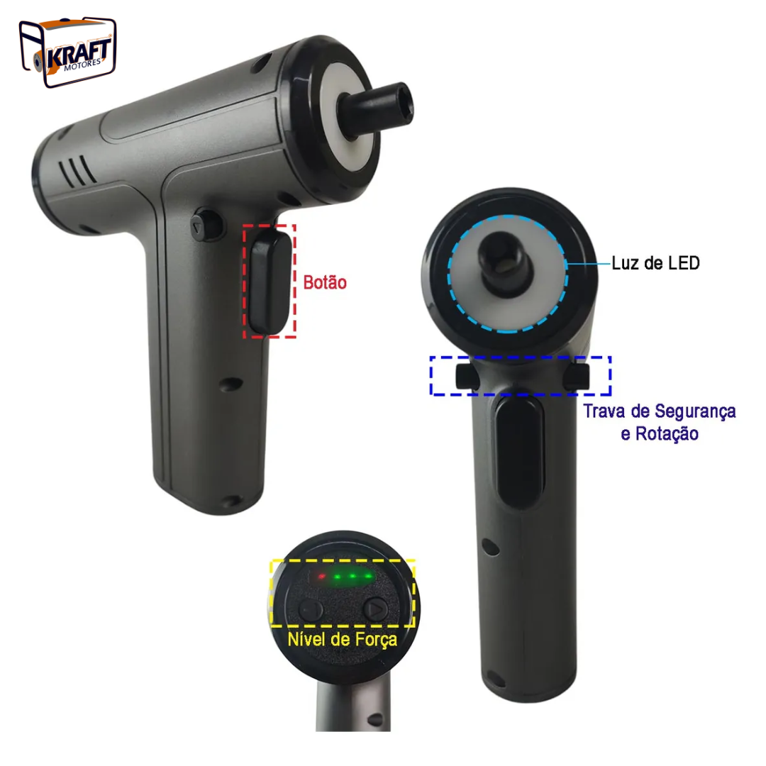 Um diferencial importante é a luz LED embutida, perfeita para trabalhar em ambientes com pouca iluminação. Além disso, conta com indicador de força e status de carregamento, trazendo mais controle e precisão para cada tarefa.