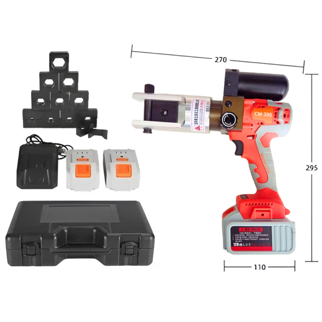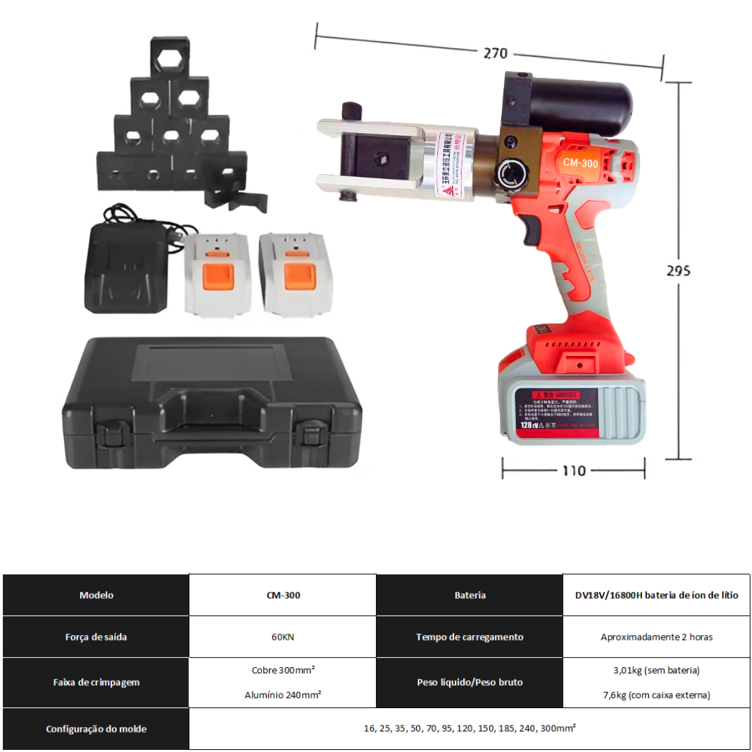 Ferramenta de Crimpagem Hidráulica Elétrica 18v, recarregável, 16-300mm² com grampos giratórios de 360°, torque: 75KN, Dobrável e com 2 baterias.
